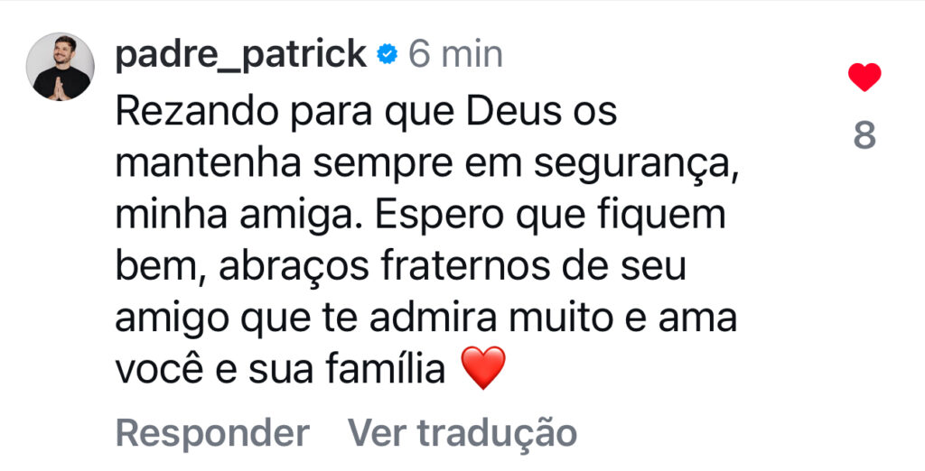 Católica, ela recebeu o apoio até do padre Patrick que tem 6,1 milhões de seguidores no Instagram. “Rezando para que Deus os mantenha sempre em segurança, minha amiga. Espero que fiquem bem, abraços fraternos de seu amigo que te admira muito e ama você e sua família”, declarou Patrick para Clediane.