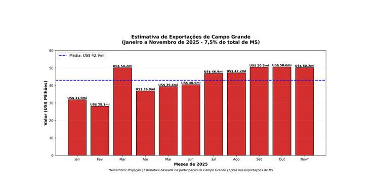 A média mensal das exportações campo-grandenses em 2025 alcançou US$ 41,8 milhões, acompanhando o ritmo de crescimento estadual e refletindo picos de atividade ligados à sazonalidade da produção e às demandas do mercado internacional. A balança comercial do município mantém-se majoritariamente superavitária, impulsionada pela alta competitividade dos produtos locais.
