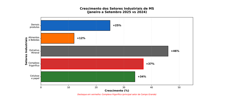 O crescimento trimestral das exportações industriais do estado em 2025 superou consistentemente os números de 2024, sinalizando um ano de recordes e expansão. Campo Grande contribui diretamente para este resultado, especialmente no terceiro trimestre, que registrou o maior volume de vendas ao exterior.