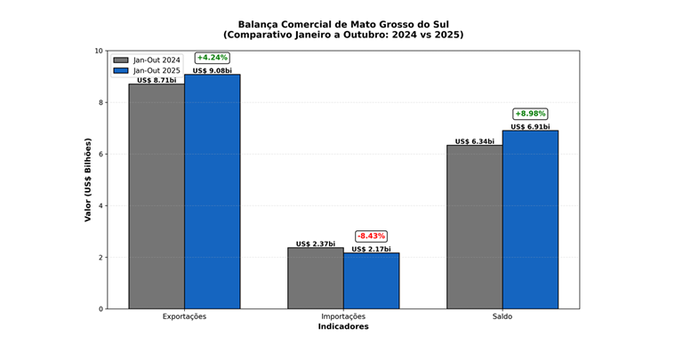 A China permanece como principal destino das exportações campo-grandenses, especialmente na compra de carne bovina e derivados do agronegócio. Os Estados Unidos seguem como parceiro relevante, mesmo diante de recentes barreiras comerciais que têm estimulado o Estado a buscar novos mercados na Ásia e na América Latina, reduzindo a dependência de destinos tradicionais. Esse desempenho está inserido em um contexto estadual positivo: de janeiro a outubro, Mato Grosso do Sul registrou um superávit comercial de US$ 6,91 bilhões, crescimento de quase 9% em relação a 2024. As exportações totais aumentaram 4,24%, enquanto as importações caíram 8,43%, segundo dados da Secretaria de Estado de Meio Ambiente, Desenvolvimento, Ciência, Tecnologia e Inovação (SEMADESC).