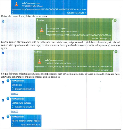 Entre as mensagens, que foram recuperadas a partir de 17 de janeiro deste ano, pois Christian estaria sem aplicativo de mensagens, ele conta para a mulher sobre os castigos que impunha para as crianças durante o tempo que ela estava fora. Em determinada situação, Christian dá risada após dar uma surra de cinto nas crianças.