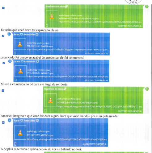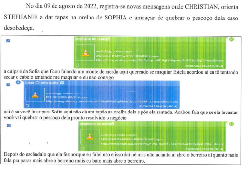 O documento foi produzido após solicitação judicial para perícia no aparelho, foi anexado ao processo, que não está em sigilo de justiça, na noite de ontem (31). Além de cintadas, chineladas, porradas e beliscões, tanto Sophia quanto o filho de Christian eram submetidos a ameaças constantes. Em uma delas, o padrasto manda que Sthepanie ameace ‘quebrar o pescoço dela”.