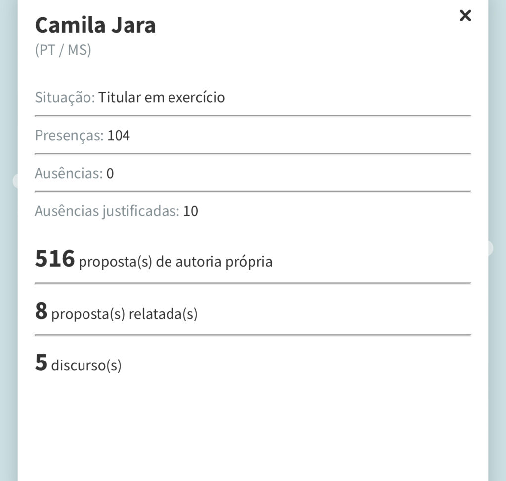 A também petista Camila Jara fez apenas 5 discursos e relatou 18 propostas no parlamento. No entanto, foi a segundo lugar em proposições com 516 propostas apresentadas.