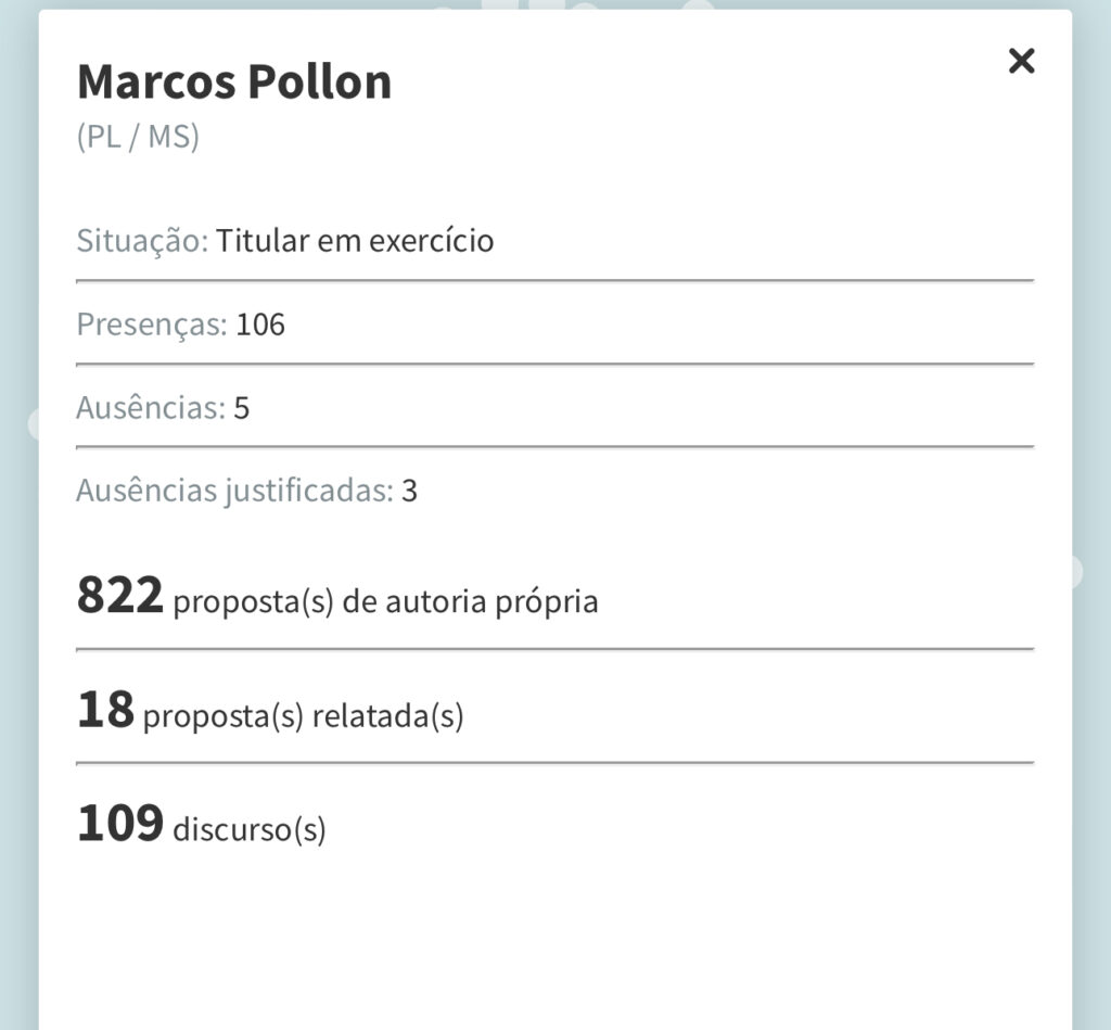 Pollon tem ainda 106 presenças, 5 ausências e 4 ausências justificadas. Também é relator de 18 propostas.
