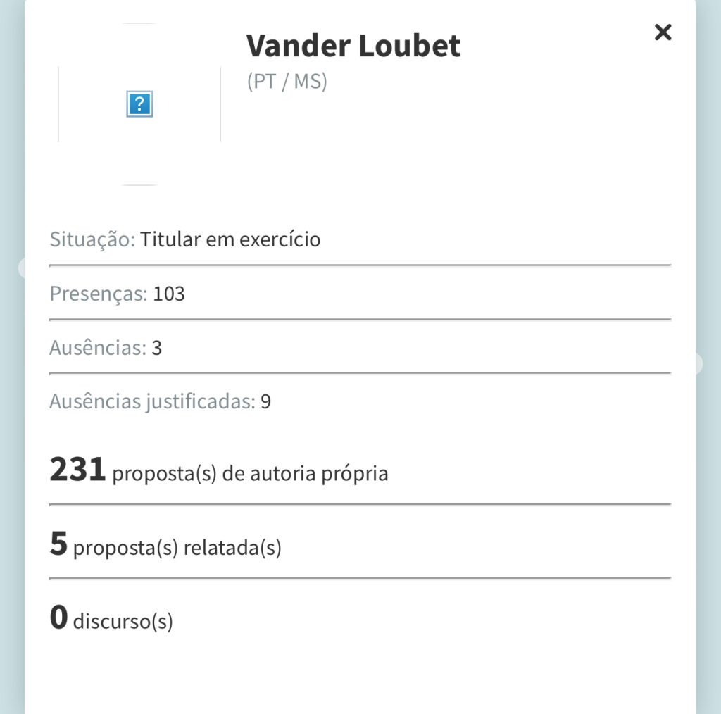 O petista Vander Loubet vai na contramão. Ele não fez nenhum discurso na Câmara Federal, porém apresentou 231 propostas e foi relator de cinco.