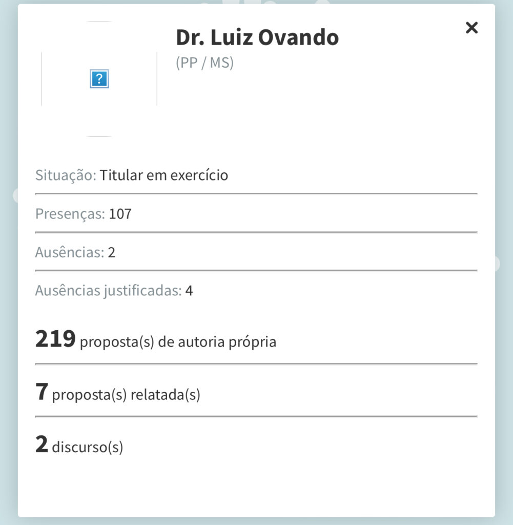 O médico bolsonarista Luiz Ovando também fez apenas dois discursos, porém apresentou 219 proposições e relatou sete. Teve 107 presenças, duas ausências e  4 ausências justificadas.