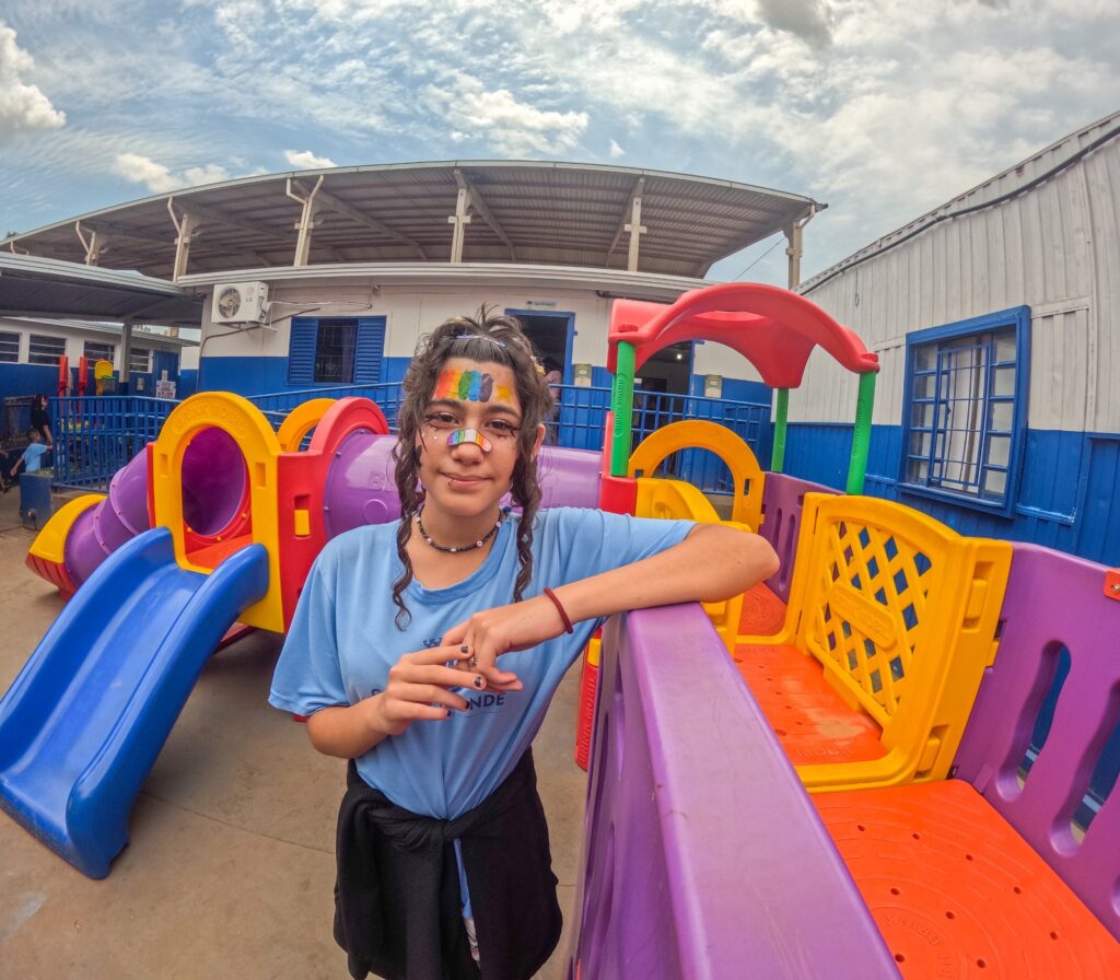Ana Alieta Adora Colhavi Quais, de 13 anos, do 8º ano, exibia com orgulho o cabelo colorido de arco-íris, afinal, era o “Dia do Cabelo Maluco” na escola. Mas conta, com carinho, a experiência de estudar ali. “É simplesmente maravilhosa! Tenho muitos amigos, a gente brinca bastante nos recreios e os professores explicam tudo direitinho. A gente vai lá, cuida de todos os animais. Eu amo os animais, principalmente as borboletas. Cuidamos de tudo, dos porquinhos também. Ano passado a gente até ajudou a capar alguns. Aprendi tudo isso aqui! Eu gosto muito do professor Vanjir — ele é diferente, ajuda as meninas no futebol, incentiva todo mundo a participar e da professora Léo. Aqui na escola a gente aprende de um jeito divertido. É um lugar que ensina de verdade e faz a gente ser feliz”.