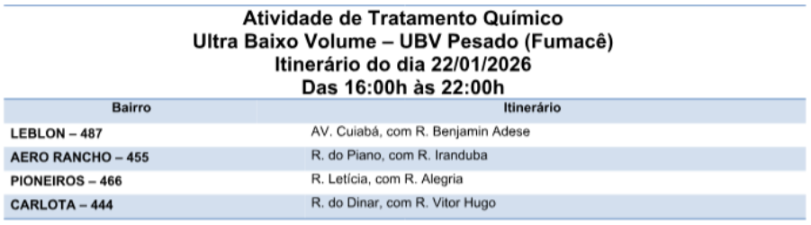 As equipes da Gerência de Controle de Endemias Vetoriais (GCEV) da Secretaria Municipal de Saúde (Sesau) circularão das 16h às 22h pelas ruas dos seguintes bairros: Jardim leblon, Aero Rancho, Pioneiros e Vila Carlota.