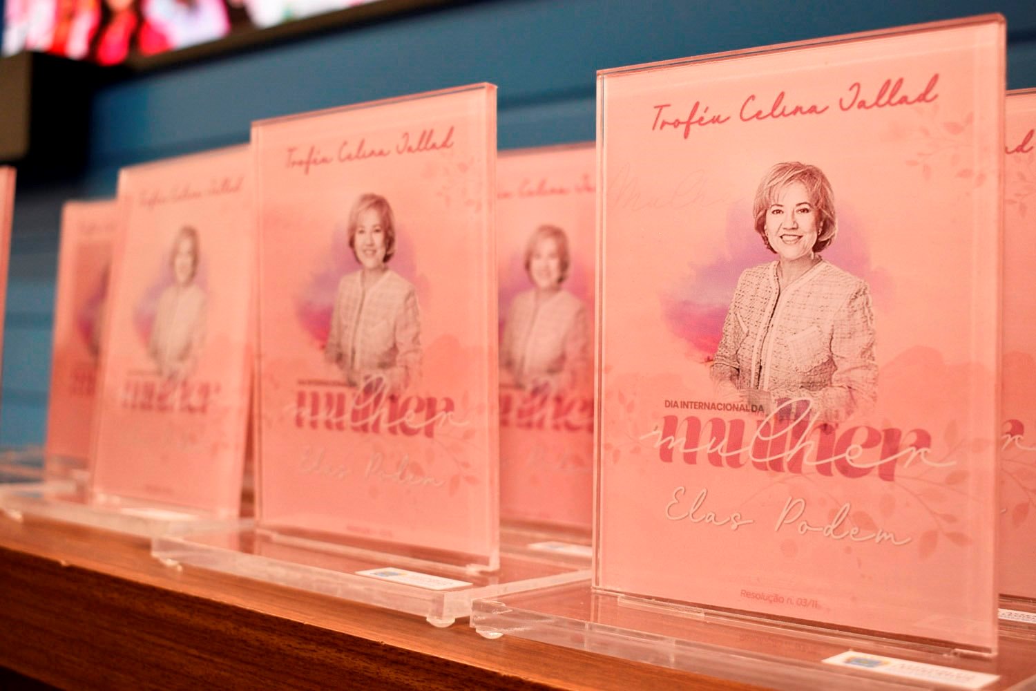 O Plenário Júlio Maia sediou nesta manhã (6) celebração alusiva ao Dia Internacional da Mulher, por proposição da deputada estadual Mara Caseiro (PSDB), em conjunto com as deputadas Lia Nogueira (PSDB) e Gleice Jane (PT). O Troféu Celina Jallad, instituído pela Resolução 03/2011, é entregue às mulheres na Assembleia Legislativa de Mato Grosso do Sul (ALEMS), ressaltando a importância da participação das mulheres nos mais diversos cenários. Na política, Celina Jallad foi a primeira mulher a presidir a Comissão de Constituição, Justiça e Redação (CCJR).