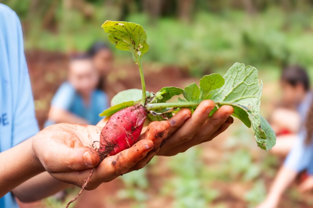 #ParaTodosVerem: foto de capa mostram alunos da escola rural durante plantação na horta; já as fotos internas, na 1ª foto aparece Glauce Soares Casimiro assim como na 3ª foto que aparece a superintendente de Gestão Escolar e Normas, Clarice de Oliveira Cassol, já nas outras são mostradas as verduras e os alunos da rede municipal