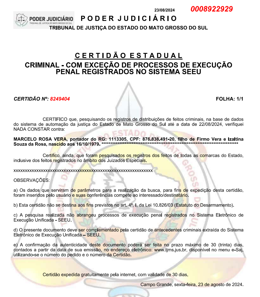 O jornal A Onça, teve acesso a certidão criminal de Marcelo da Rosa Vera e trouxe na íntegra para que os leitores possam ter acesso a essa informação. O documento foi expedido ontem, após as acusações da namorada do moto entregador terem muita repercussão na internet, inclusive afirmando que esse homem “já viveu demais” ou “porque ainda não está preso”.