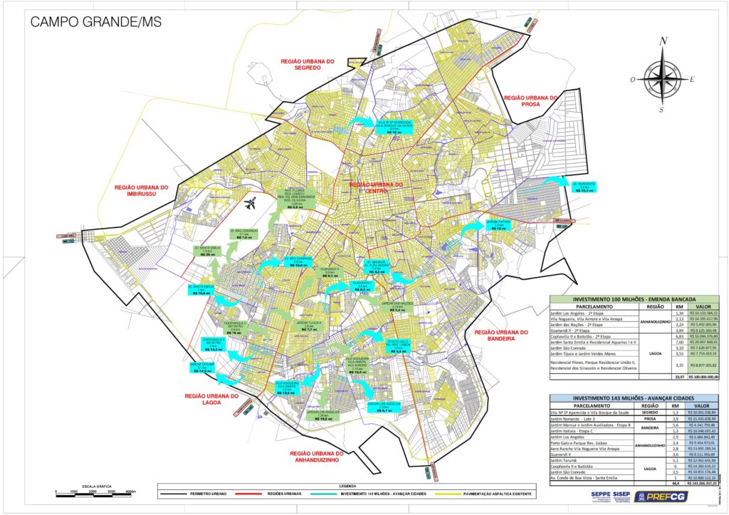 Na região do Anhanduizinho, serão 9,546 km de pavimentação, beneficiando bairros como Jardim Los Angeles, Aero Rancho, Vila Nogueira, Vila Amapá, Jardim das Nações, Guanandi II e Vila Aimoré.
