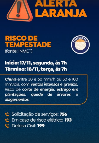O alerta laranja do Inmet permanece até terça-feira (18), às 7h. A população pode solicitar atendimento pelos telefones 156 e 199, que funcionam 24 horas por dia.