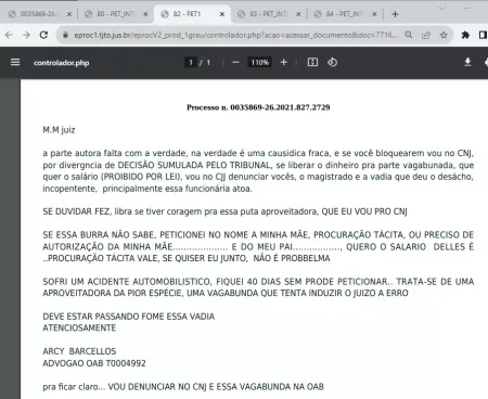 No documento, ele afirma também que esteve afastado por um acidente de carro e não pôde advogar, e acusa a autora do processo de se aproveitar do caso: “uma vagabunda que tenta induzir o juizo (sic) a erro”. E complementa com mais ofensas: “deve estar passando fome essa vadia”. E ameaça de denunciar a servidora à OAB e ao CNJ.