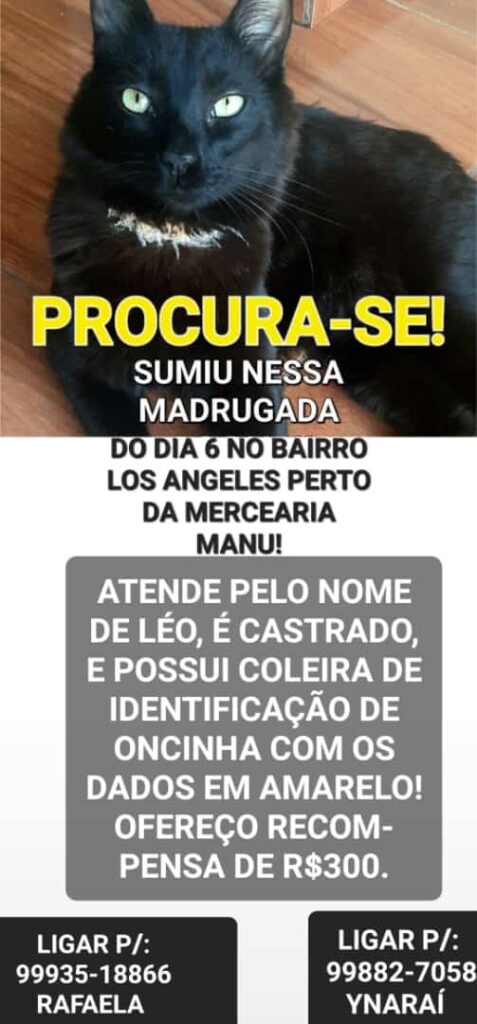 A família da professora Rafaela está a procura de Leo, um gatinho preto, castrado e que sumiu na madrugada desta quarta-feira (6) próximo a mercearia Manu na região do Bairro Los Angeles em Campo Grande (MS).