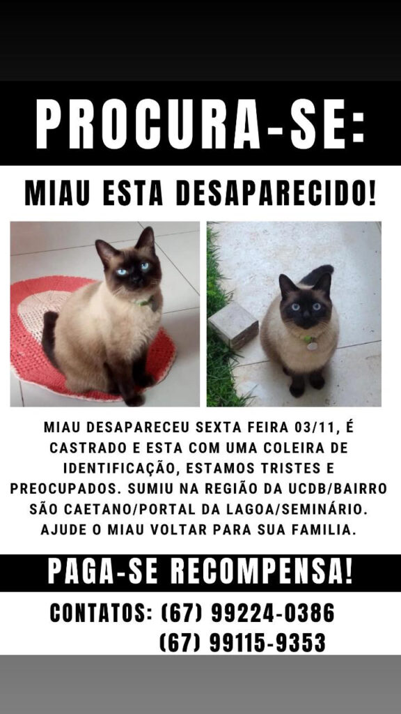 Quem viu o Miau pode entrar em contato pelo número (67) 99224-0386.